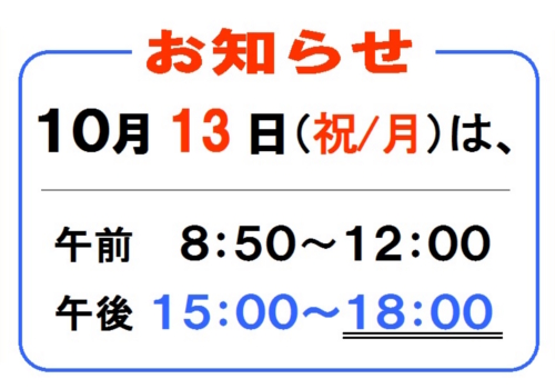 尚、10/13(日)の診療におきましては、HPにて掲載させていただきます。