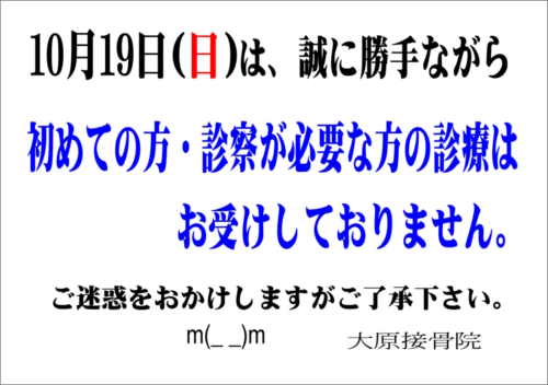 2025年10月19日(日) 午前診療(8:50~12:00)は諸事情につき、初診の診察ができません。